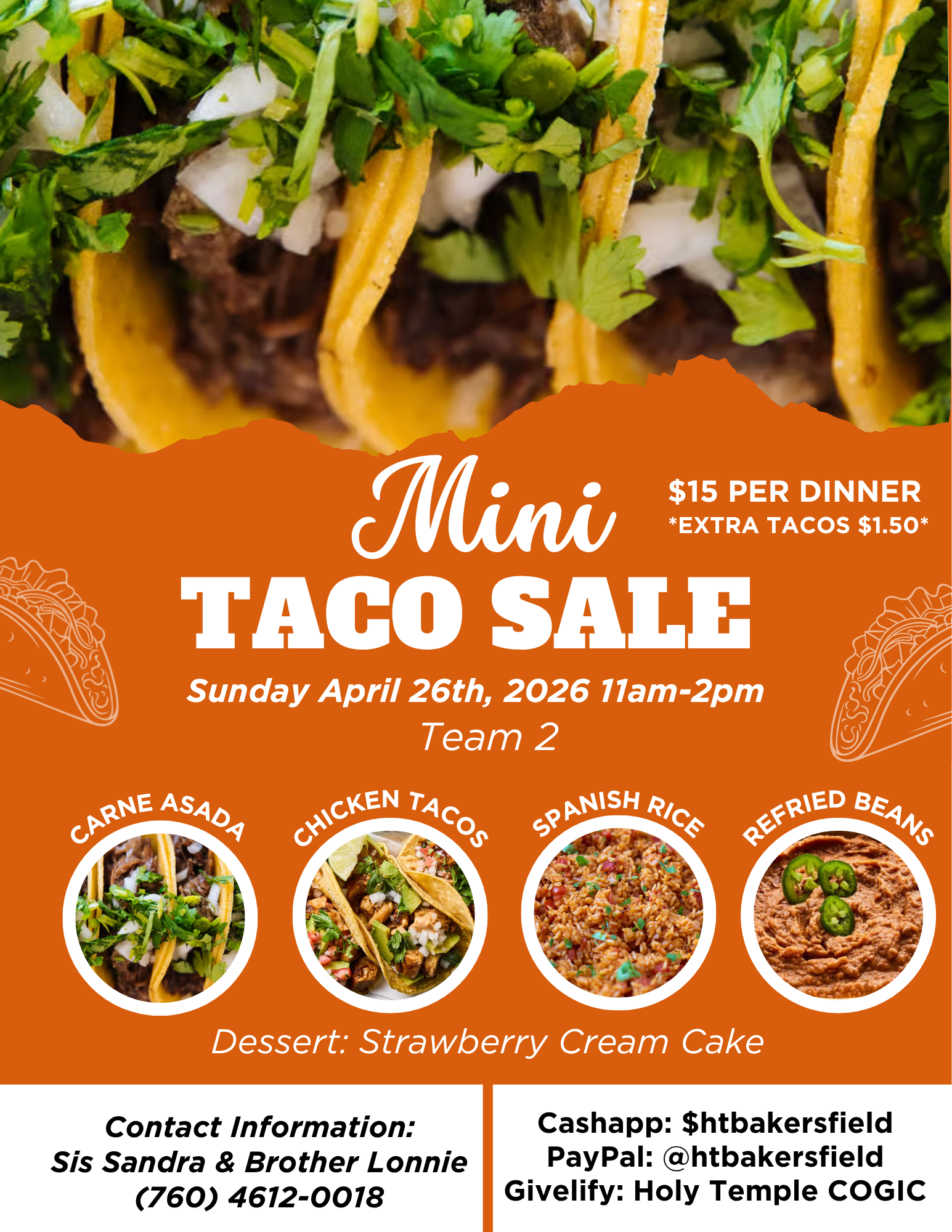 Home Events - HOLY TEMPLE MEMBERSHIP PORTAL Mini Taco Sale Date Apr 26 2026 Expired! Time 1:00 pm - 2:00 pm Mini Taco Sale This Sunday Team 2 will be having a Mini Taco Sale following Sunday’s service. Share this event + Add to Google Calendar + iCal / Outlook export The event is finished.